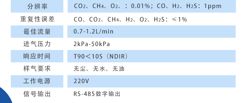 CO2、CH4、:≤±1%FS;CO、O2、H2、H2S::≤±2%FS |