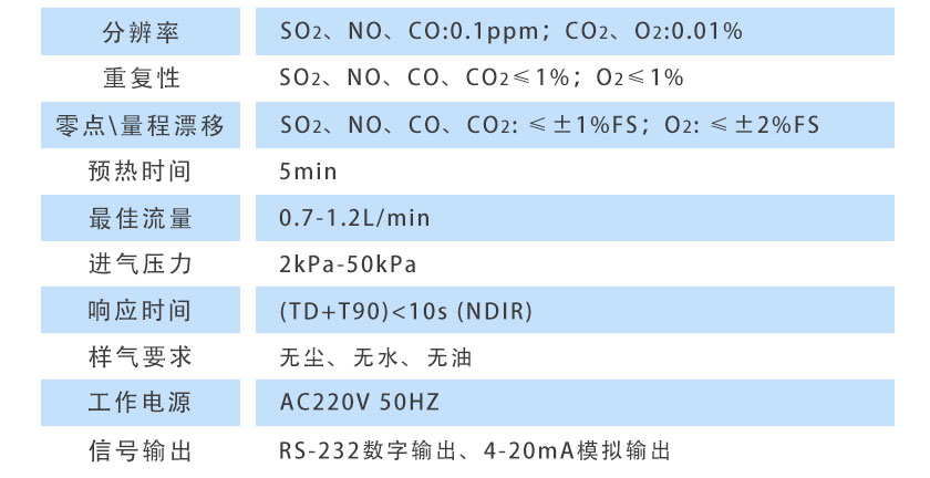 SO2、NO、CO、CO2≤±1%FS;O2≤±2%FS |
